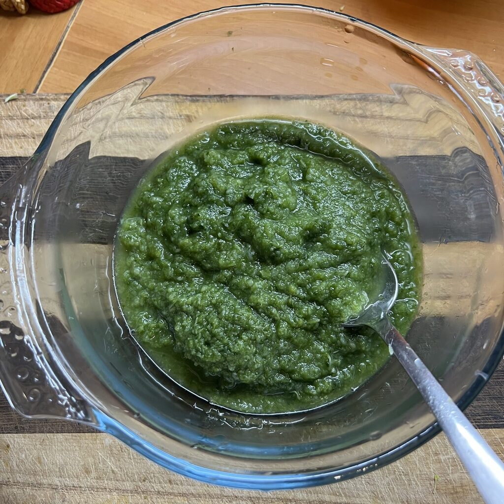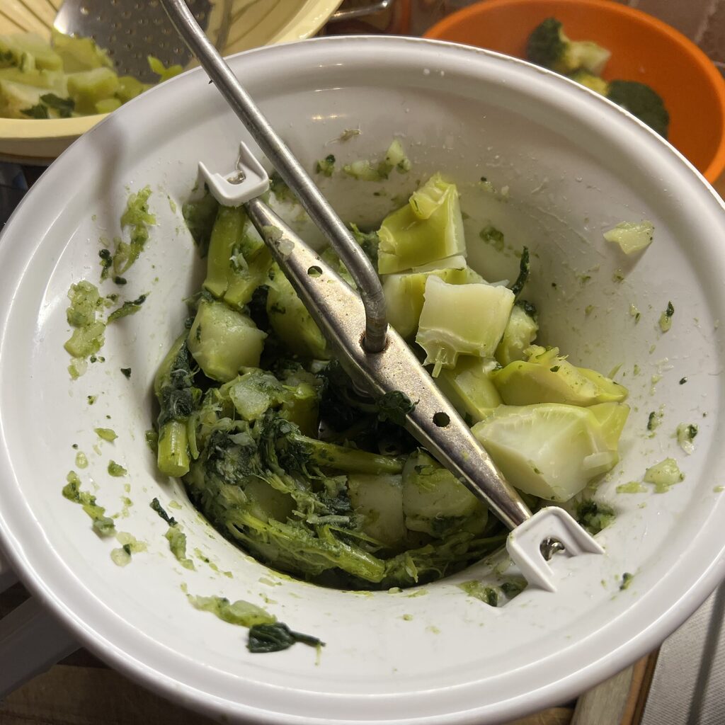 Faites bouillir les tiges et les feuilles des brocolis dans de l’eau bouillante salée pendant environ 30 minutes, jusqu’à ce qu’elles soient tendres, puis passez-les au moulin à légumes