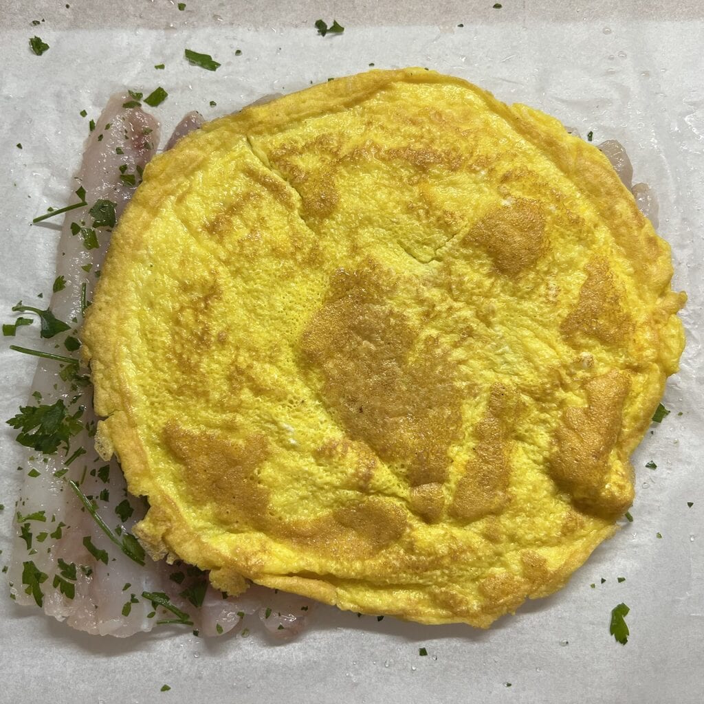 Couvrez avec une deuxième feuille de papier sulfurisé et aplatissez délicatement avec l’aide d’un attendrisseur de viande pour aplatir légèrement le poisson