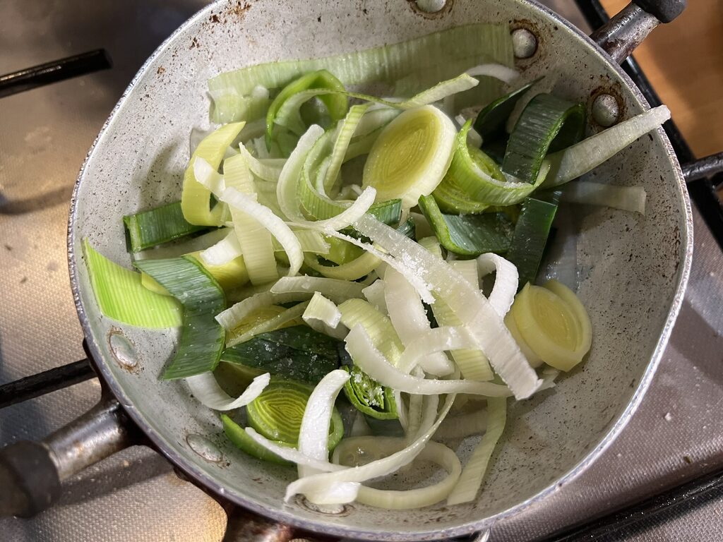 Mettez de côté environ 1/4 du poireau en rondelles que vous ferez revenir dans une poêle avec une demi-cuillère d’huile d’olive et une pincée de sel