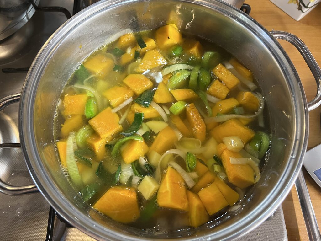 Préparation du velouté de potiron avec poireaux et brocolis