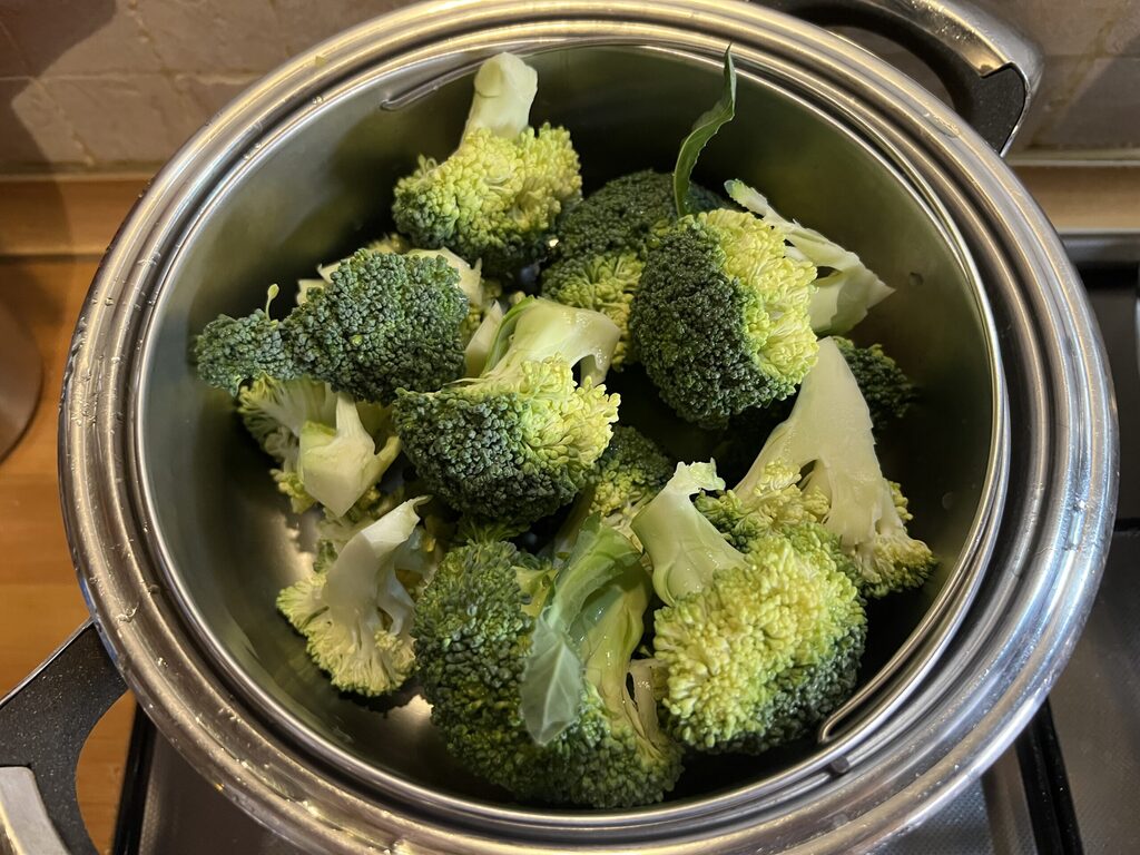Entre-temps, nettoyez la tête du brocoli et coupez-la en fleurettes que vous ferez cuire à la vapeur pendant environ 10 minutes (elles doivent être tendres, mais ne pas s’écraser)