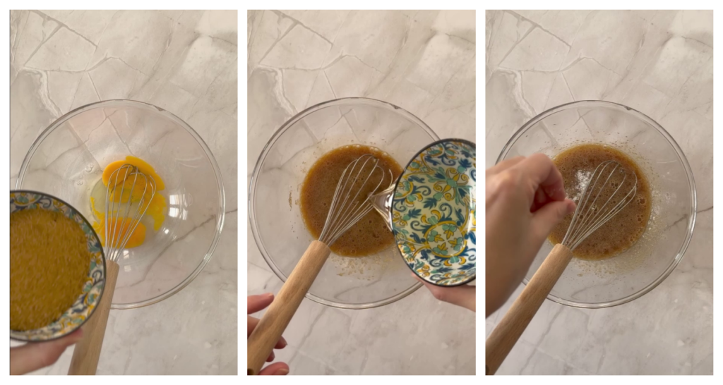 • Pour préparer les biscuits craquelés au chocolat, commencez par casser les œufs dans un bol, ajoutez le sucre roux, l’huile de tournesol, une pincée de sel et mélangez rapidement avec un fouet manuel.