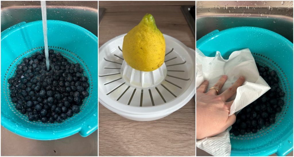 Pour préparer la compote de myrtilles, commence par stériliser les bocaux que tu vas utiliser pour ta compote. Ici, tu trouveras les différentes méthodes de stérilisation expliquées. Lave soigneusement les myrtilles sous l’eau froide courante et tamponne-les avec du papier essuie-tout pour les sécher. Mets dans une casserole, arrose avec le jus de 1 citron et laisse reposer au frigo pendant 2 heures.