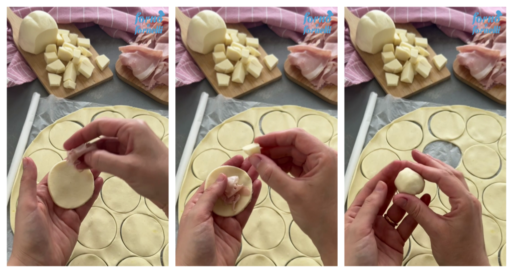 • Mettez au centre de chaque disque un peu de jambon cuit et un morceau de provola, que vous aurez préalablement coupé. Fermez les boules en pinçant bien le fond.