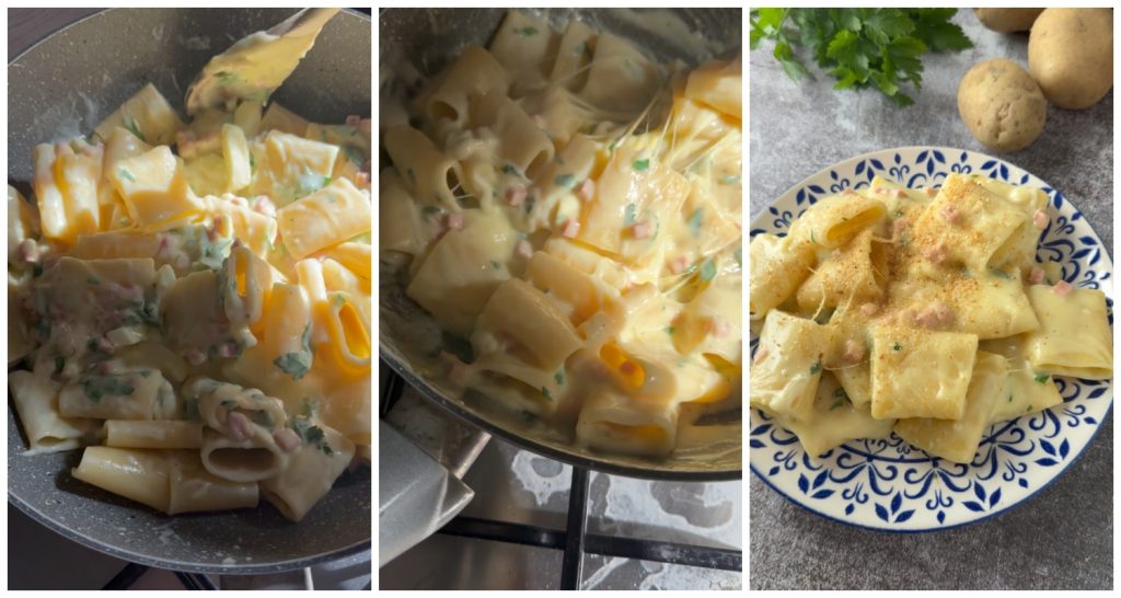 Fais cuire les pâtes dans de l’eau bouillante salée, égoutte-les et mets-les dans une grande poêle. Ajoute la crème de pommes de terre et les dés de jambon cuit.