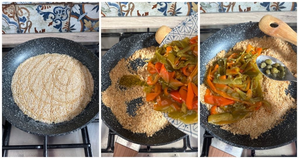 Dans une autre poêle, faites griller la chapelure en utilisant l’huile de cuisson des poivrons. Lorsqu’elle est bien dorée, ajoutez également les poivrons, les câpres, le persil haché et faites sauter quelques minutes pour mélanger les saveurs. Servez chaud ou froid, selon votre goût. Bon appétit !