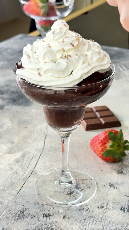 La base est une crème au cacao dense et veloutée, sans œufs ni beurre, que l’on prépare sur la plaque en mélangeant à peine. Une fois refroidie, elle devient la chose la plus gourmande que tu puisses servir dans un verre. Avec de la crème fouettée par-dessus et une fraise fraîche, tu obtiens un dessert digne d’applaudissements.