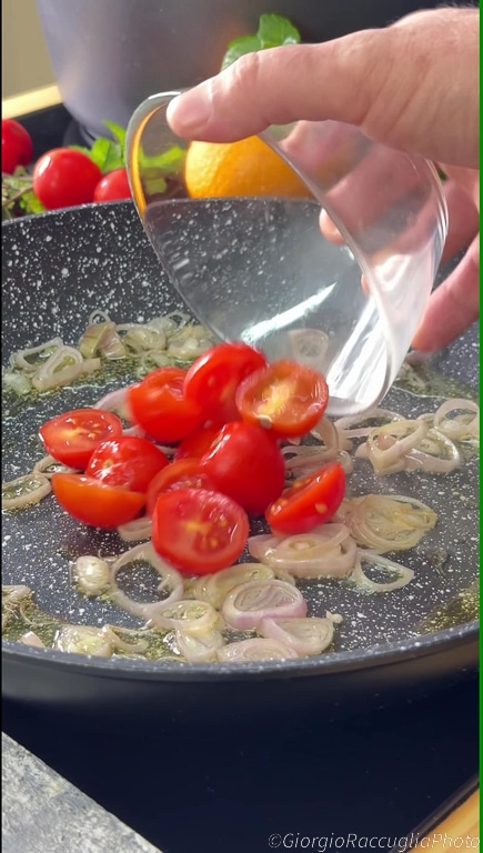 Ajoutez les tomates cerises et faites cuire pendant cinq minutes à feu doux, en écrasant les tomates pour qu’elles libèrent leur jus.