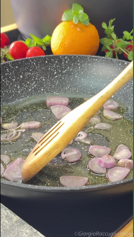Maintenant, nous avons tous les ingrédients prêts pour cuisiner l’espadon à l’orange. Faites dorer l’échalote dans une poêle avec de l’huile d’olive extra vierge.