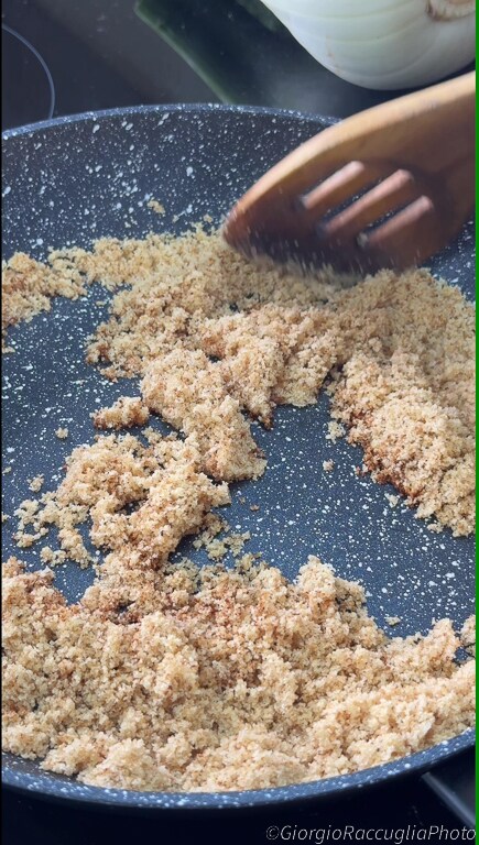 Retirez la poêle du feu, et versez la chapelure grillée mise de côté préalablement,