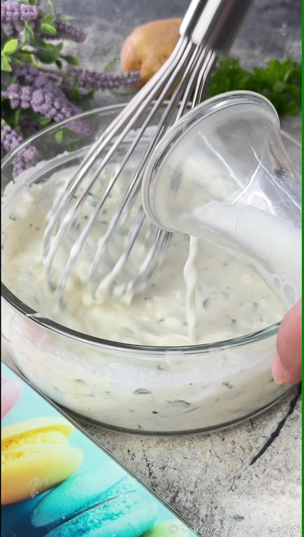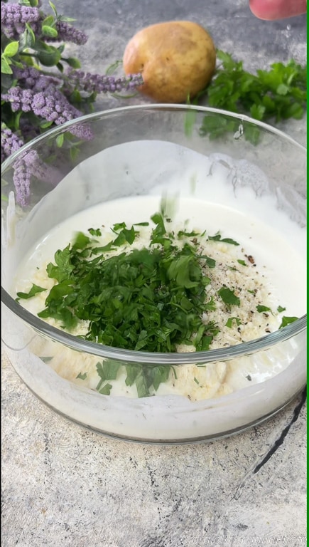 versez le mélange de lait, parmesan et herbes sur les pommes de terre et