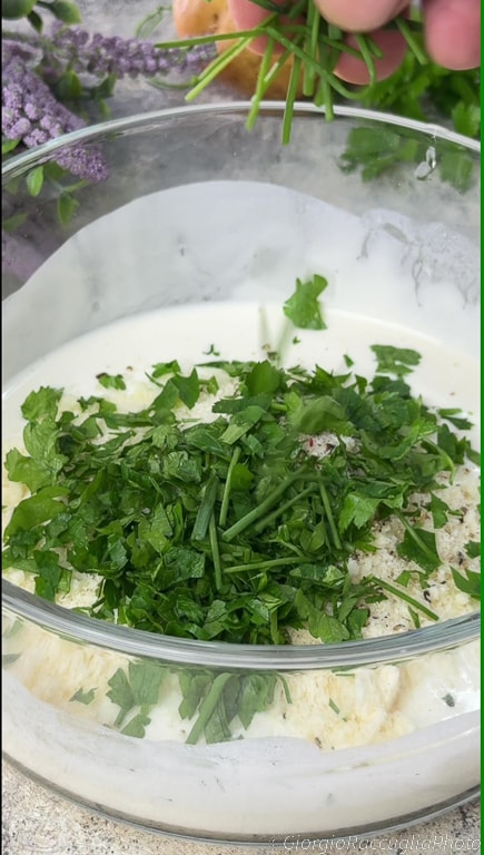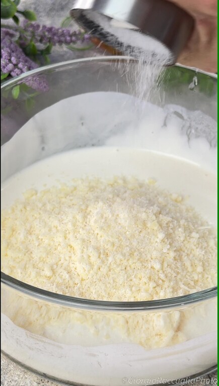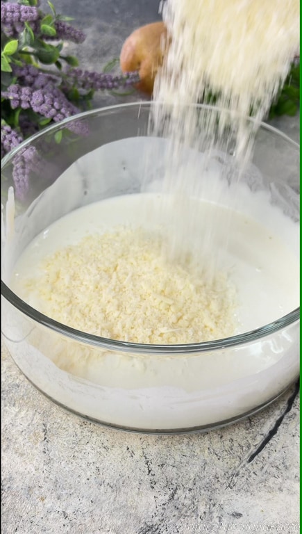 Maintenant, versez 220 g de lait ou de crème fraîche dans un bol et ajoutez 30 g de parmesan râpé,