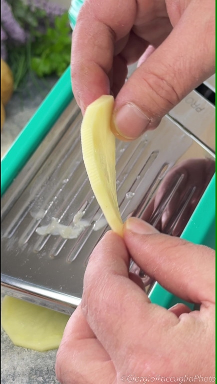 tranchez-les avec une mandoline, les pommes de terre doivent toutes être de 3 mm.