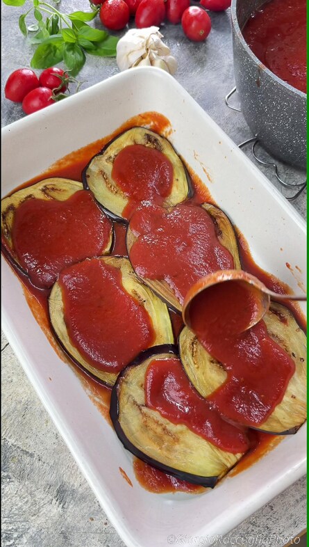 Quand la sauce tomate sera prête et les aubergines toutes frites, il ne te reste plus qu’à assembler le plat. Verse un peu de sauce tomate au fond d’un plat à gratin,