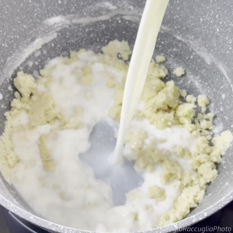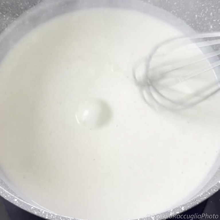 Ajoute maintenant la farine et mélange avec un fouet à main, verse le lait, le sel, le poivre et la noix de muscade et continue de mélanger