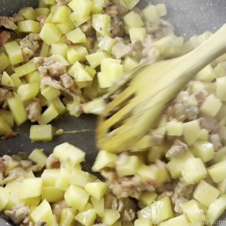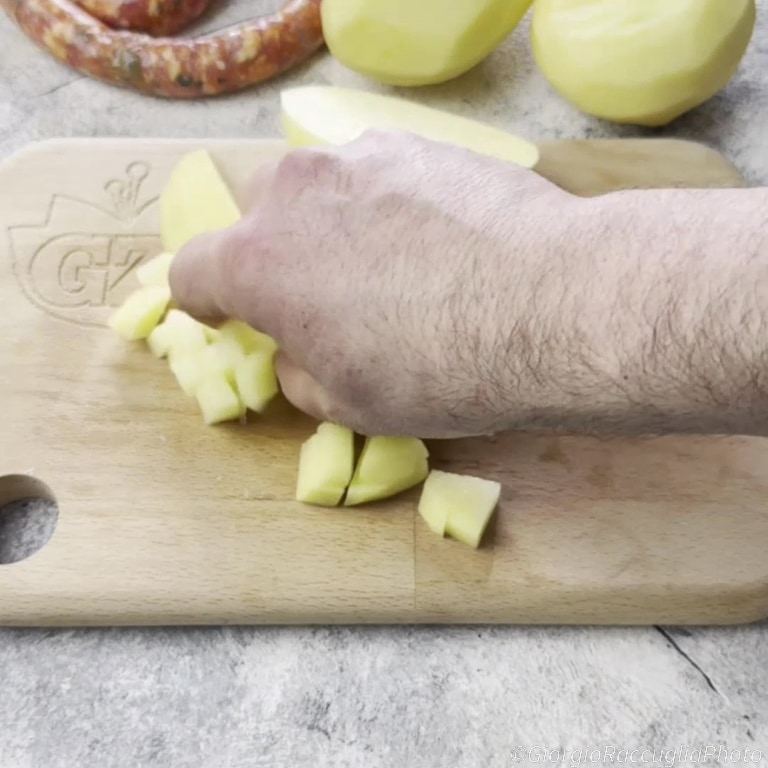 Pour préparer les pâtes au four avec pommes de terre et saucisse, commence par nettoyer et peler les pommes de terre puis, coupe-les en petits cubes.
