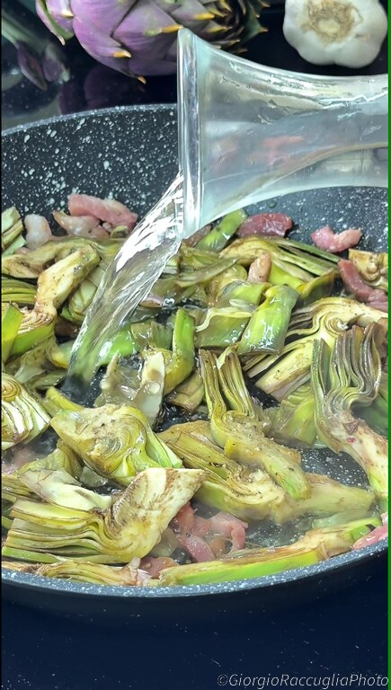 Les artichauts, protagonistes de cette recette, sont des légumes au goût unique, légèrement amer et à la texture tendre, qui se marient parfaitement avec le goût intense de la pancetta. Pour rehausser leur saveur sans la masquer, ils sont sautés à la poêle avec de l’ail, qui apporte une base aromatique discrète mais essentielle. La pancetta, quant à elle, est rissolée jusqu’à devenir croustillante, ajoutant une note fumée et savoureuse à la sauce.
