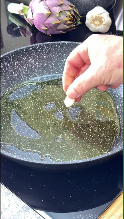 Maintenant, mettez dans une poêle une gousse d’ail avec de l’huile d’olive extra vierge,