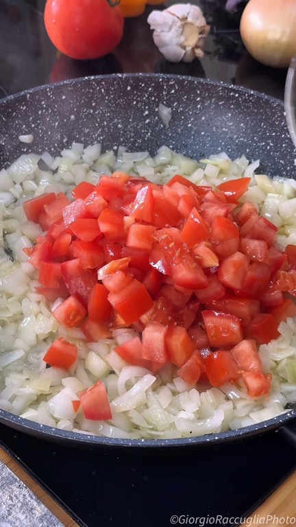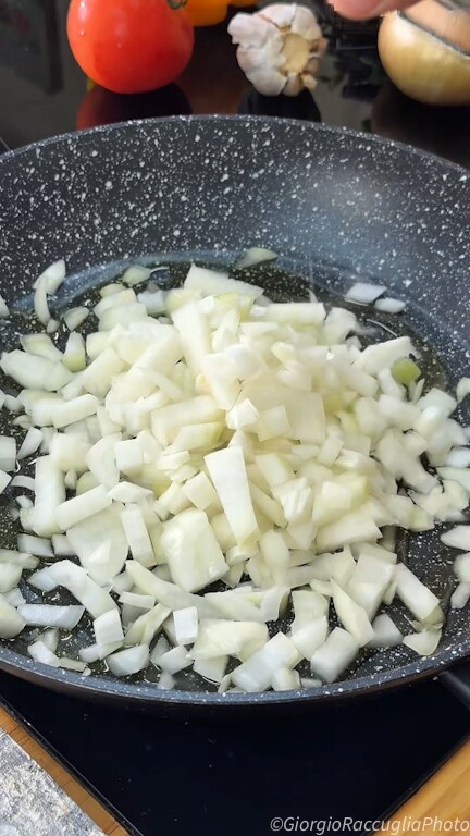 Pour préparer les poivrons farcis au riz, émincez finement les oignons et coupez en morceaux le poivron vert et la tomate. Dans une poêle, faites chauffer l’huile d’olive. Ajoutez l’oignon émincé et faites-le revenir.