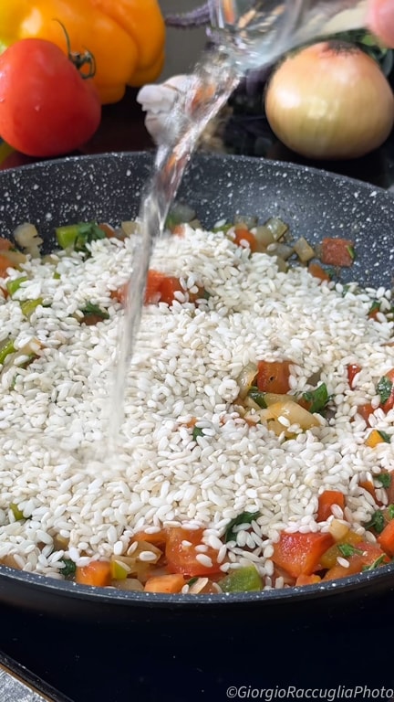 Maintenant, ajoutez le riz dans la poêle, versez 500 g d’eau et