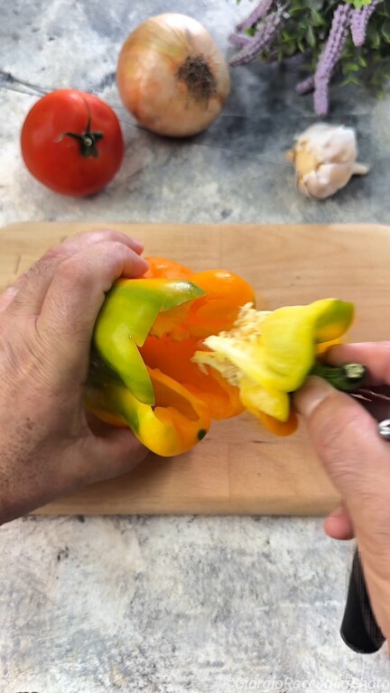 En attendant, lavez les petits poivrons, coupez le capuchon supérieur et videz-les des graines et des filaments internes.