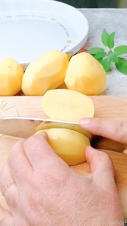 Pour préparer les pommes de terre au four avec persil, sauge et lardons, commencez par éplucher les pommes de terre,