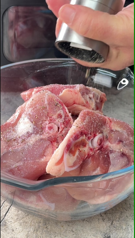 Pour préparer le poulet avec pommes de terre à la friteuse à air, commence par transférer le poulet dans un bol,