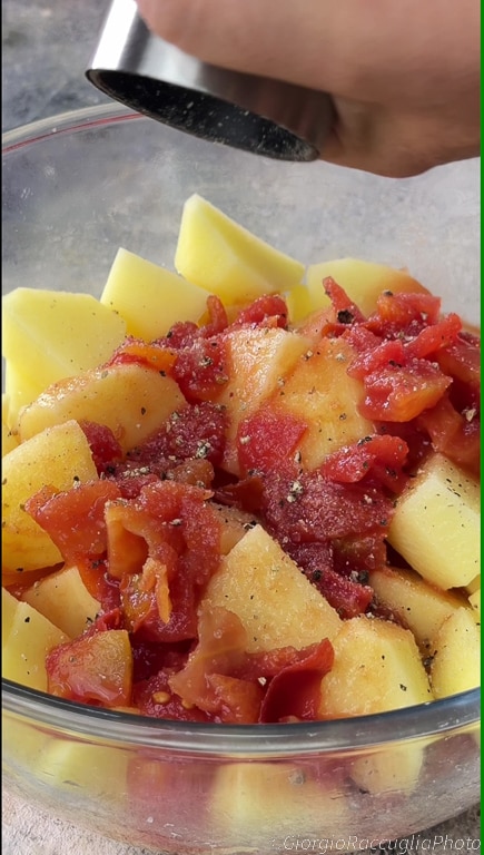 Les pommes de terre, coupées en morceaux et cuites avec le poulet, deviennent moelleuses et savoureuses, imprégnées des jus de cuisson de la viande. L’ajout de tomates en morceaux et d’oignons émincés crée une base savoureuse et légèrement humide, parfaite pour accompagner le poulet et les pommes de terre. Un généreux filet d’huile d’olive extra vierge complète le tout, offrant au plat une texture dorée et un goût riche.