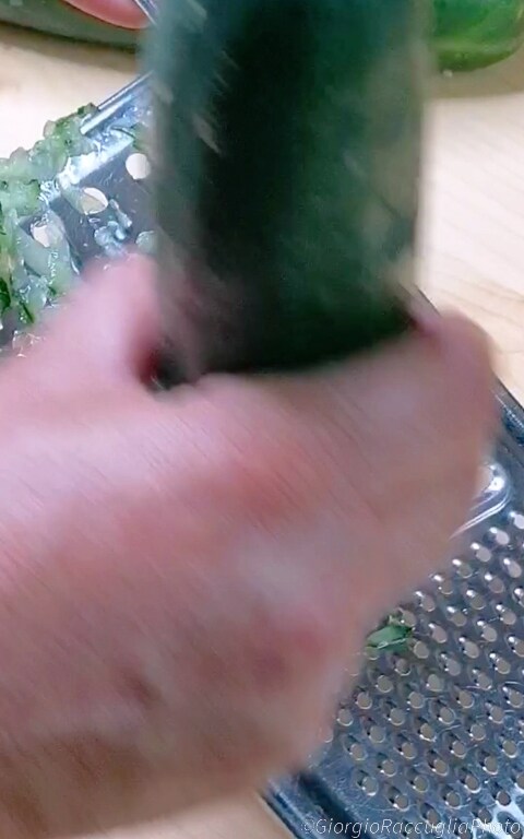 Transférez le concombre râpé dans une passoire placée au-dessus d’un bol et laissez reposer au moins une heure, pour qu’il perde son eau de végétation.