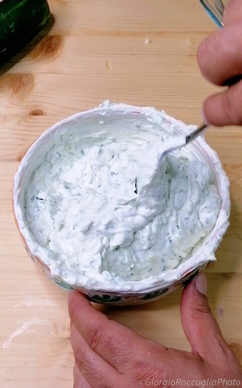 Passée l’heure, versez le yaourt dans un bol, ajoutez le concombre après l’avoir pressé avec un chiffon et mélangez avec une cuillère, pour bien amalgamer le yaourt et le concombre.