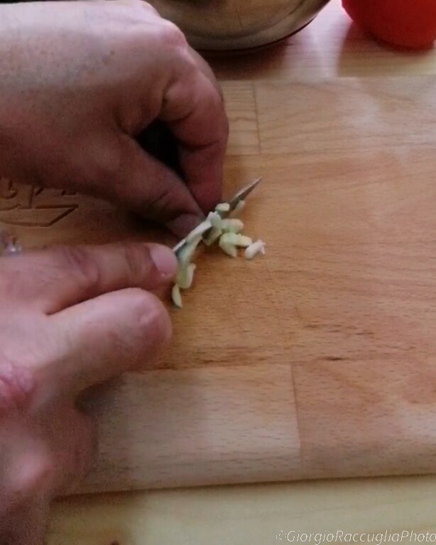 Dans une poêle, chauffez l’huile d’olive extra vierge et faites revenir l’ail haché,