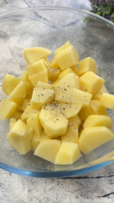 Transférez dans un bol les pommes de terre coupées en dés et assaisonnez avec le sel,