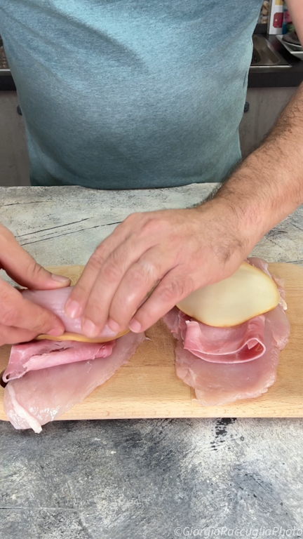 Pour préparer les rouleaux de poulet, étalez les tranches de blanc de poulet sur une planche à découper. Ajoutez une tranche de jambon cuit par-dessus et