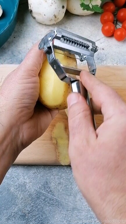 Nettoie les pommes de terre et épluche-les avec un éplucheur.