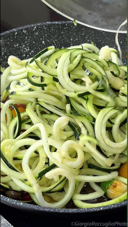 Lavez bien les courgettes, enlevez les extrémités et avec un spiraliseur, réalisez des spaghettis fins.