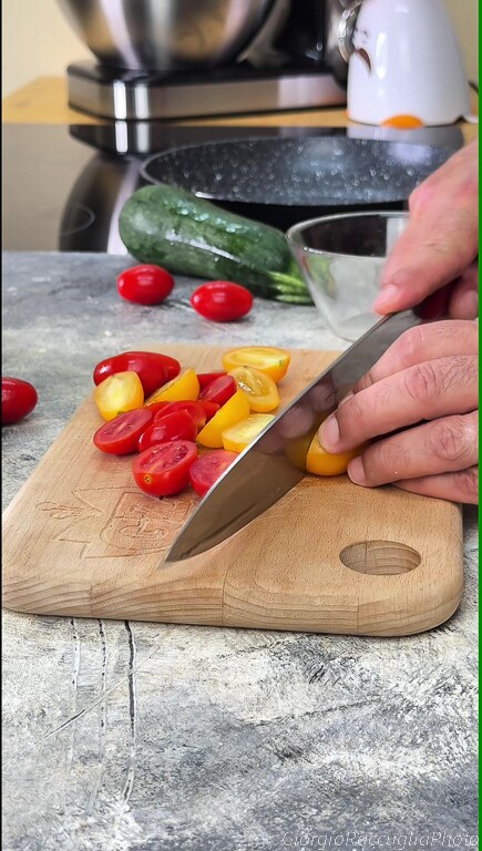 Lavez les tomates cerises rouges et jaunes, coupez-les en deux.