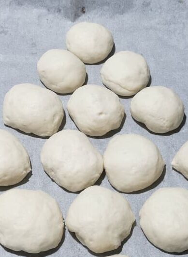 On laisse lever jusqu’au doublement du volume puis on divise la pâte en 16 portions.