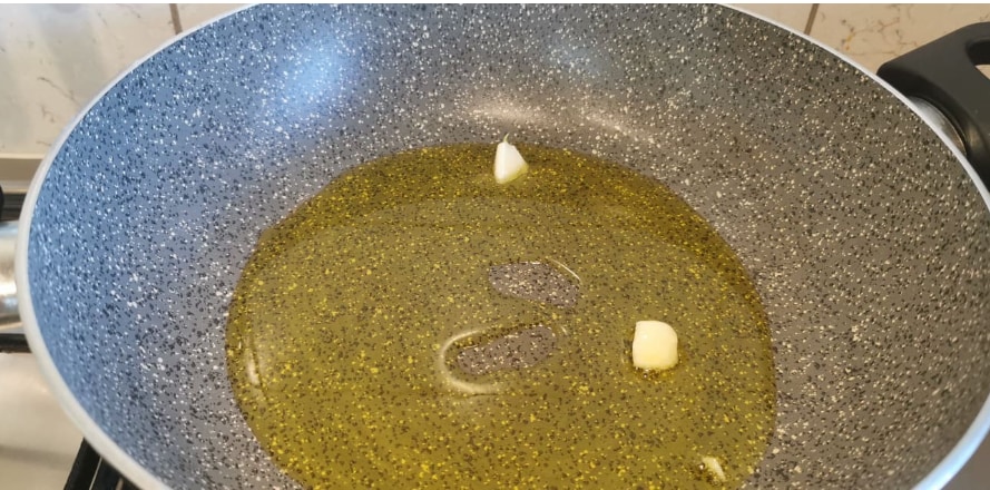 Dans une poêle assez grande, versez une bonne quantité d’huile et ajoutez la gousse d’ail écrasée.