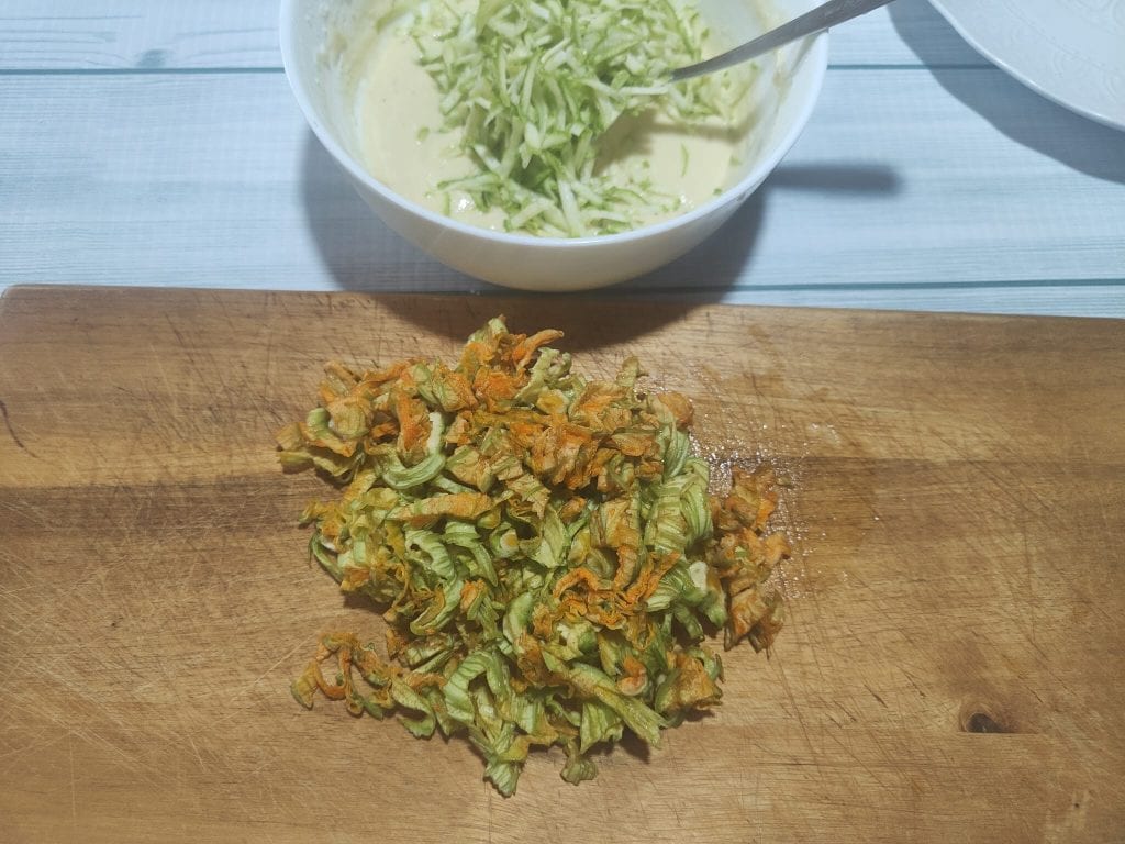 • Incorporez à la pâte préparée les fleurs de courge et la courgette précédemment découpées en morceaux, mélangez le tout.