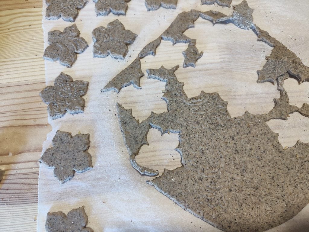 Placez-la au réfrigérateur pendant une demi-heure, mais vous pouvez aussi l’utiliser immédiatement si vous le souhaitez.Une fois refroidie, étalez-la en une pâte d’environ 3 mm d’épaisseur et, à l’aide d’un emporte-pièce, découpez les biscuits de votre choix. Pour la moitié des biscuits, découpez un trou central (dans mon cas, une petite fleur).
