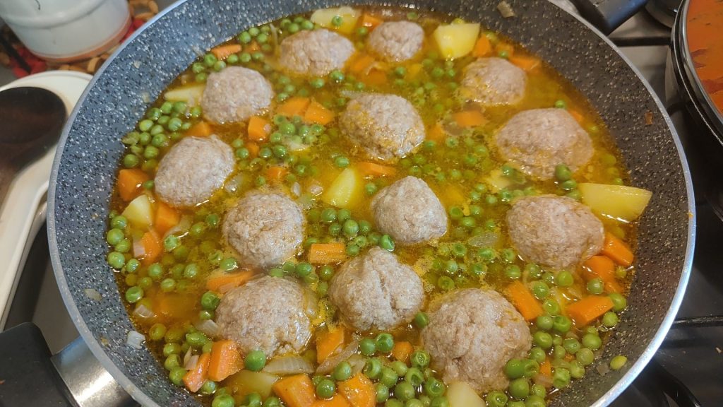Et nous cuisons nos boulettes en sauce avec des petits pois et des pommes de terre jusqu’à ce que tout soit parfaitement cuit, en remuant de temps en temps.