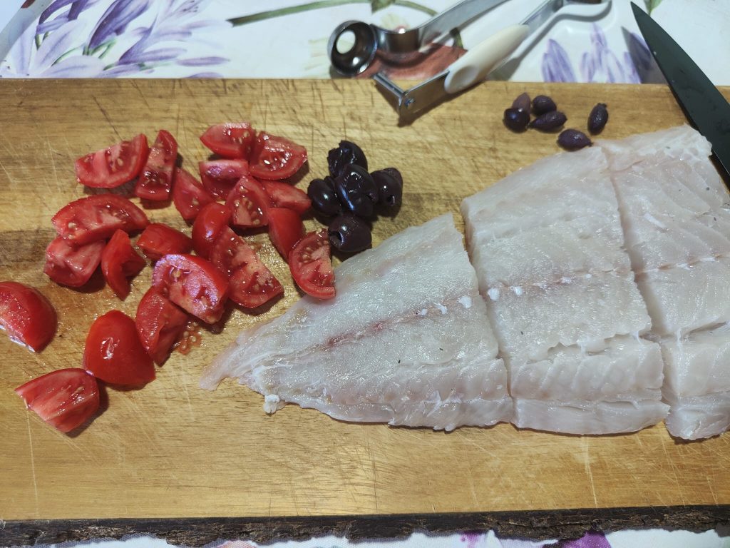 Couper les filets de cabillaud à la bonne taille.Dénoyautez les olives et coupez-les en rondelles.