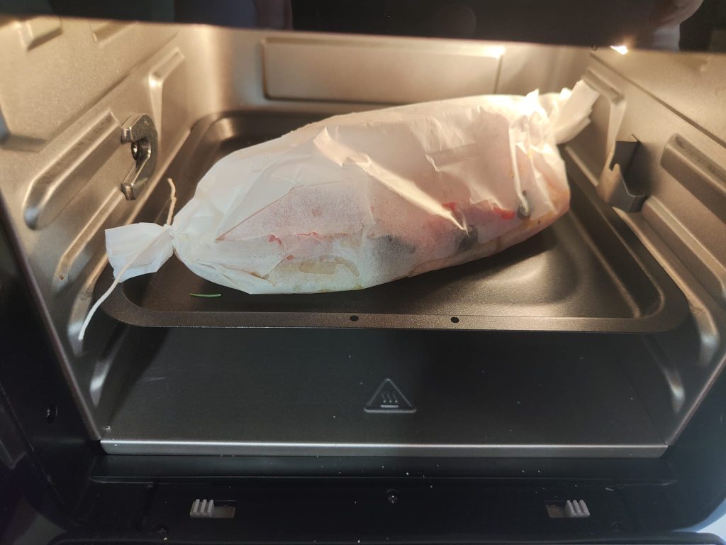 La cuisson se fait dans un environnement humide, dans la friteuse, pour conserver saveur et tendreté. Mais pas de panique, si vous n’avez pas de friteuse à air, la papillote se cuit dans le four électrique, même procédure mais les temps de cuisson changent, en effet dans le four à 180 pendant 30/35 minutes.