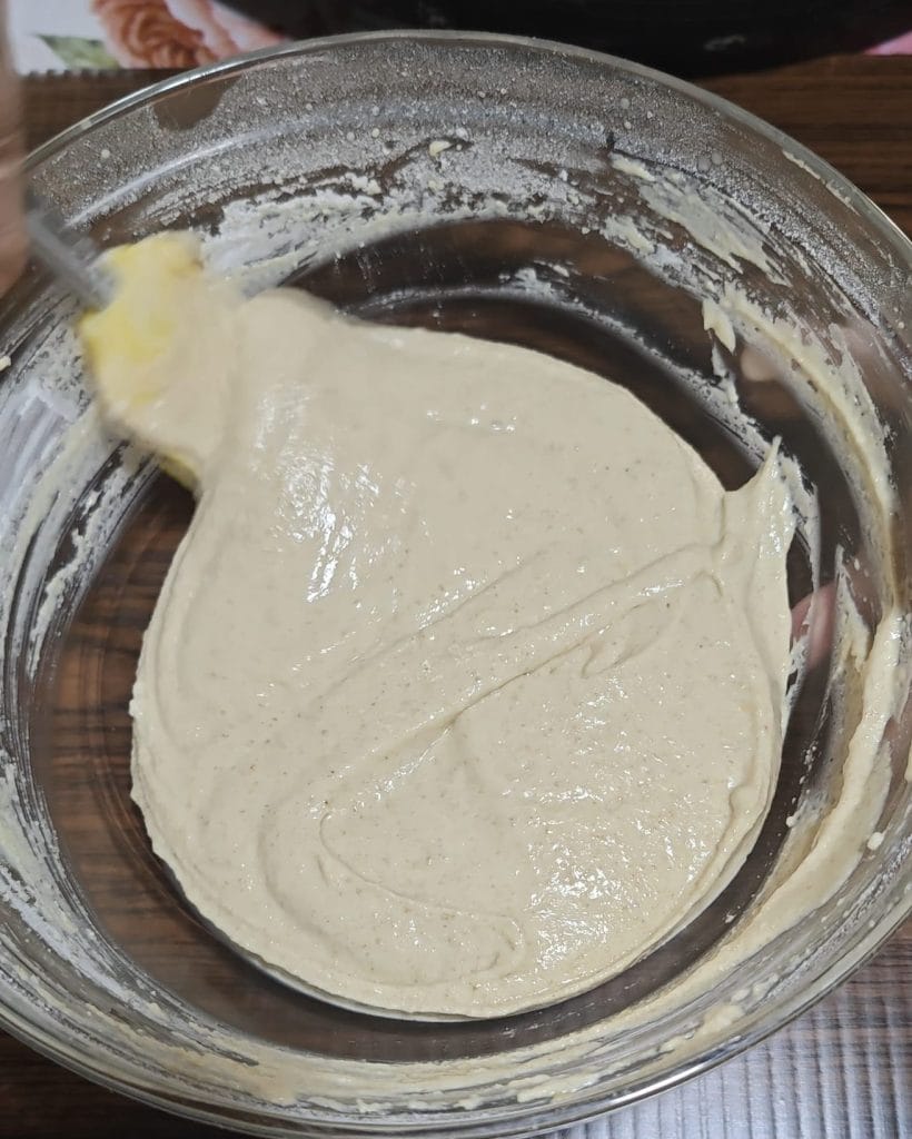 Ensuite, incorporez l’huile, le yaourt, l’eau, la vanille et le zeste de citron, mélangez et ajoutez les farines avec la levure tamisées, puis mélangez jusqu’à obtenir une pâte crémeuse et lisse.