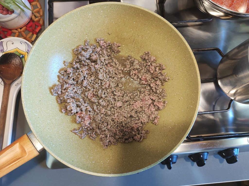 Pendant que la sauce cuit, mettez un peu d’huile dans une poêle, ajoutez la viande hachée et la saucisse émiettée;