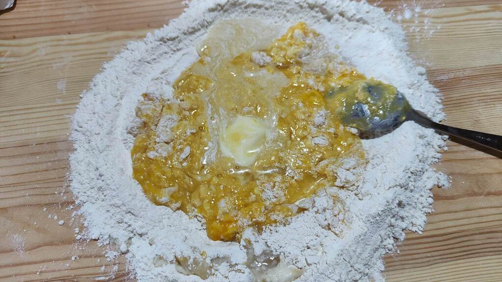 À ce stade, placez au centre les œufs, la pincée de sel, le zeste d’une orange, le beurre à température ambiante et le vin blanc.Commencez avec une fourchette à battre les ingrédients et intégrez peu à peu la farine des bords vers le centre.