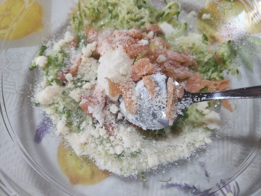 • Dans un bol, mélange les courgettes avec le saumon fumé coupé en morceaux, la béchamel (3 cuillères à soupe), le parmigiano râpé, et la ricotta, le sel, le poivre et le persil haché.