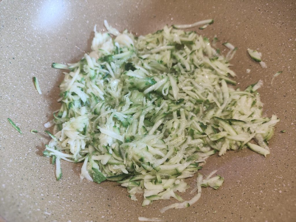 Dans une poêle, chauffe un filet d’huile avec une gousse d’ail. Ajoute les courgettes et laisse-les dorer à feu moyen pendant environ 5-7 minutes, jusqu’à ce qu’elles ramollissent et perdent leur eau de végétation. Assaisonne de sel et de poivre.
