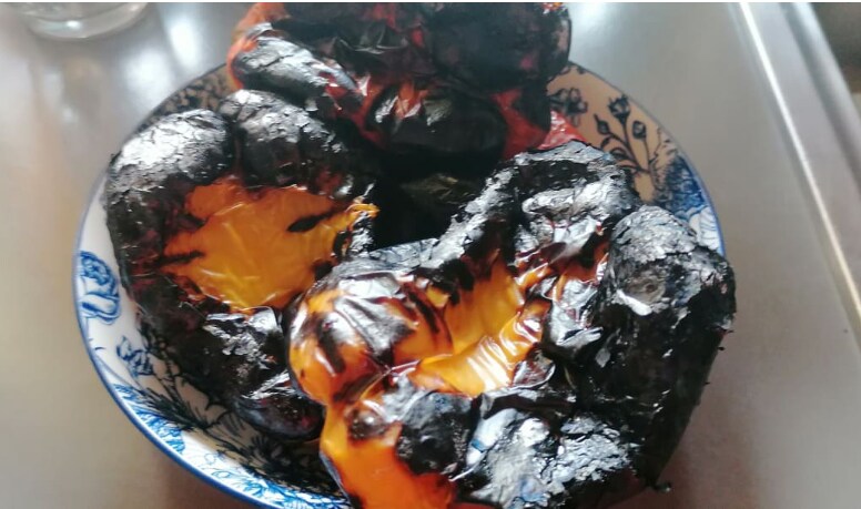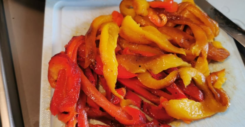 (Vous grillez les poivrons selon vos goûts : au barbecue, sur la plaque, au four). L’important c’est qu’ils soient cuits, mais pas trop cuits.