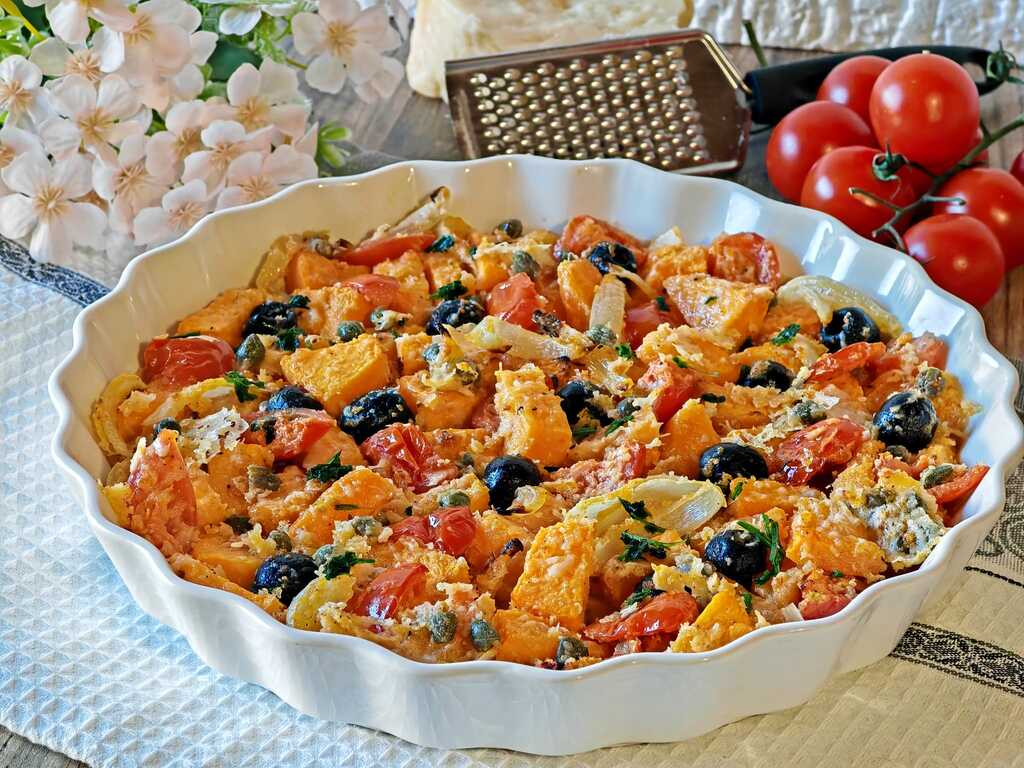 Courge gratinée à la méditerranéenne. Un accompagnement d’aspect rustique mais très élégant et au goût délicat, avec un parfum savoureux. Qu’attendez-vous pour l’essayer ?